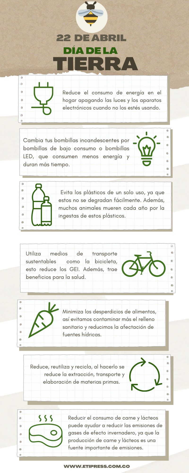 Reseña: Este sábado, y cada 22 de abril, se celebra el Día Mundial de la Tierra. Es una fecha importante para Etipress S.A que tiene el objetivo de concienciar a la humanidad sobre los problemas de la superpoblación, la contaminación y la importancia de la conservación de la biodiversidad. Aquí te dejamos unas acciones que puedes implementar en la vida cotidiana para el cuidado y mantenimiento del planeta.